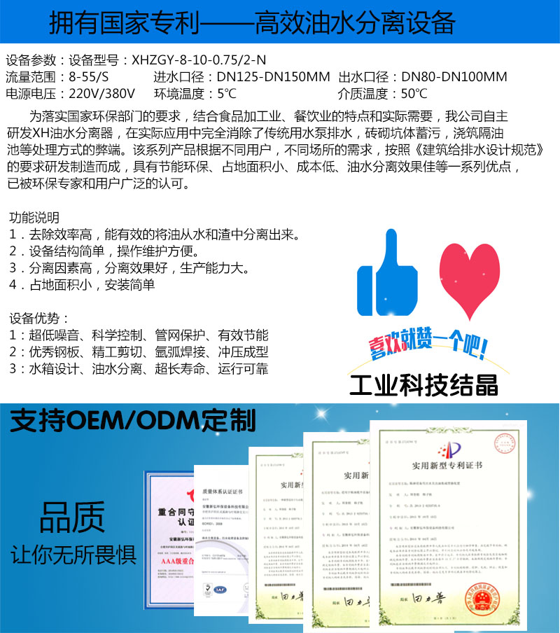 设计背景:为落实国家环保部门的要求,结合食品加工业、餐饮业的特点和实际需要,我公司自主研发XHZGY油水分离器,在实际应用中完全消除了传统用水泵排水,砖砌坑体蓄污,浇筑隔油池等处理方式的弊端。该系列产品根据不同用户,不同场所的需求,按照《建筑给排水设计规范》的要求研发制造而成,具有节能环保、占地面积小、成本低、油水分离效果佳等一系列优点,已被环保专家和用户广泛的认可。