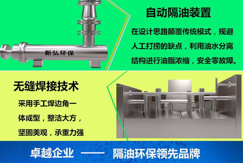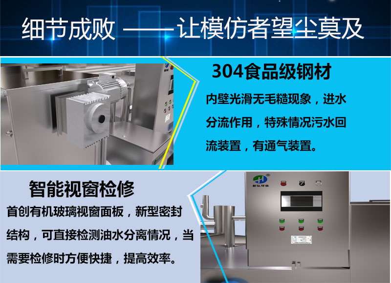 二:全自动集油刮油系统:由独创360°全方位刮油装置、自动集油系统、自动出油系统等集合而成,拥有多个技术和外观专利,是隔油设备油脂分离率的核心所在。